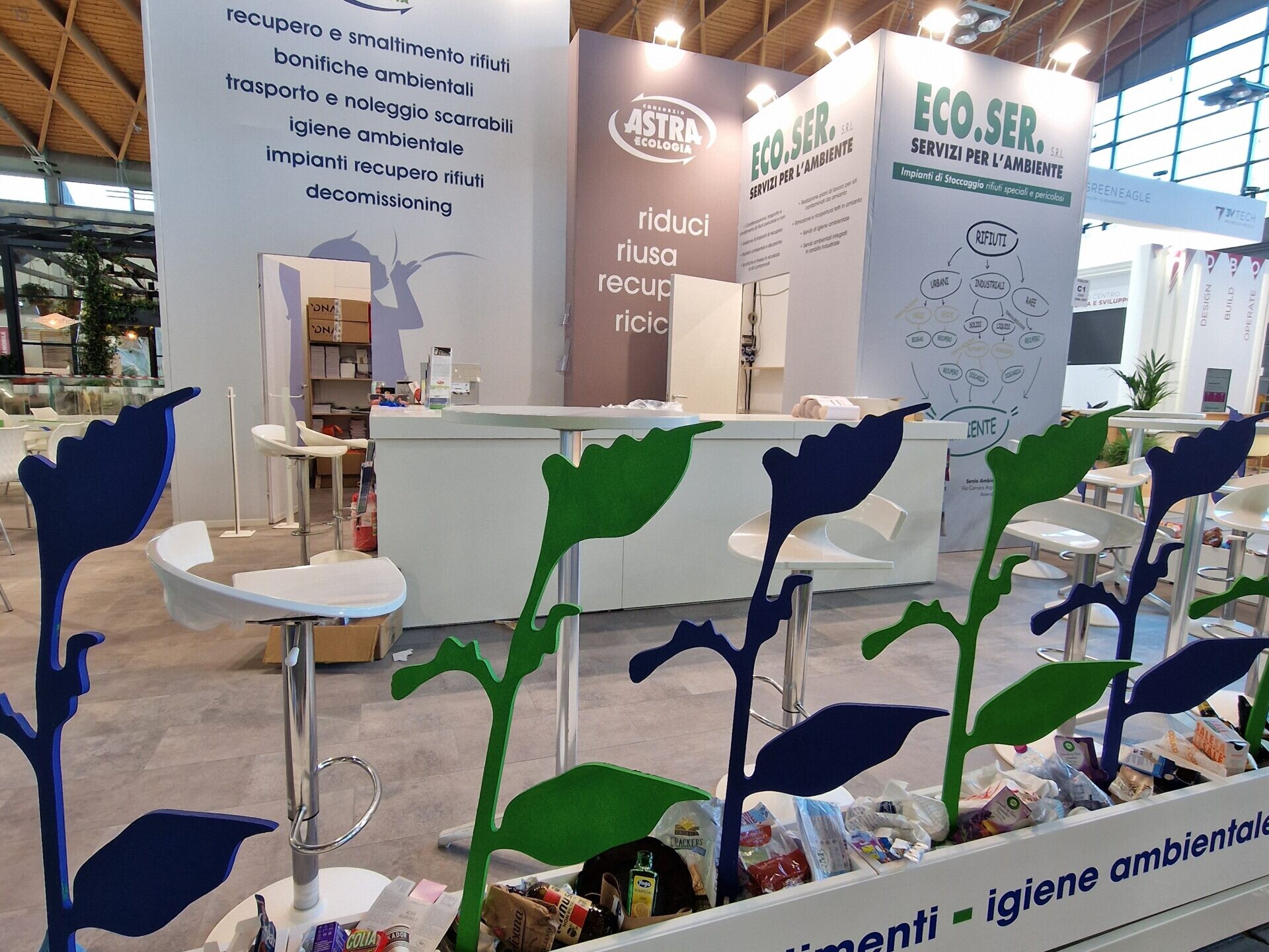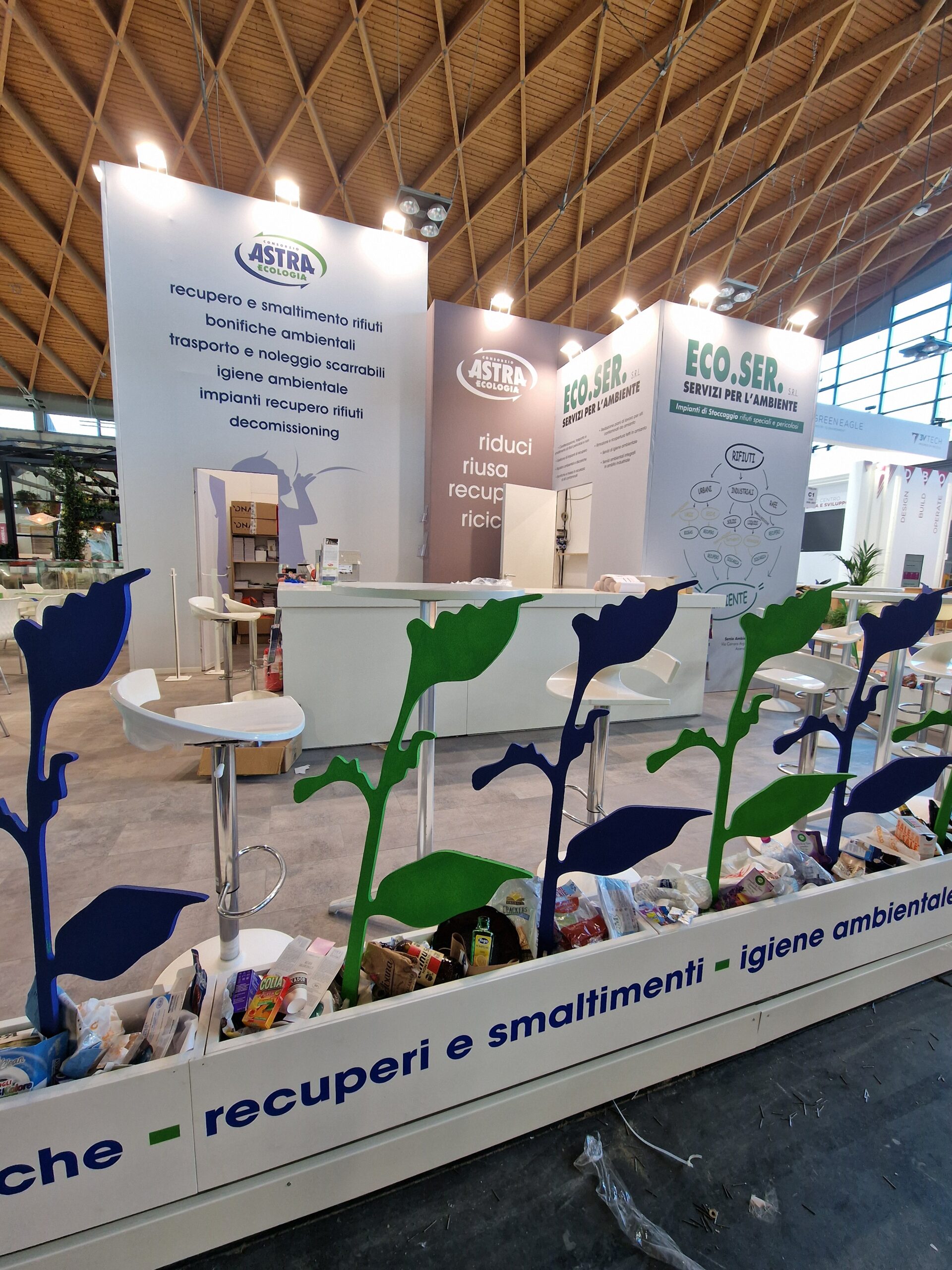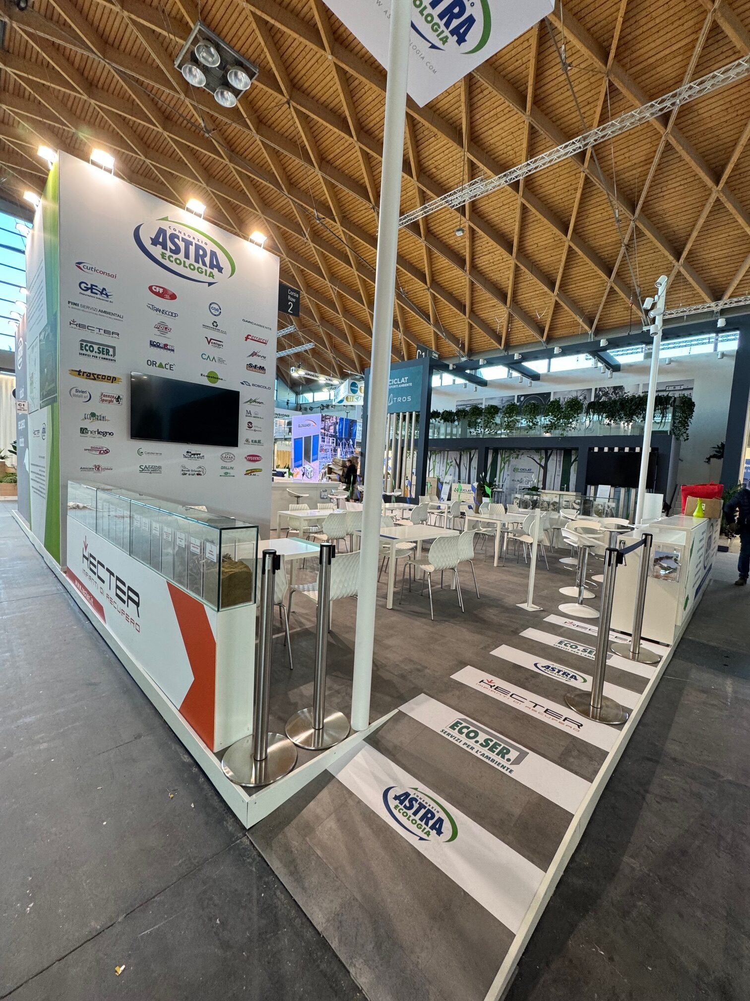 Qui sotto trovate alcuni esempi di stand realizzati in conformità con i principi della sostenibilità: progetti che uniscono design, funzionalità e responsabilità ambientale.